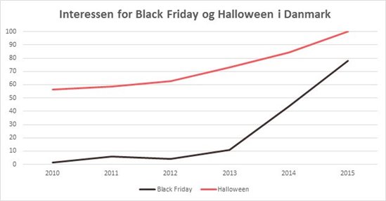 Denne blogpost handler om, hvordan du kan udnytte den store og stigende interesse for shoppingbegivenheder, til at tjene ekstra penge på din webshop, din affiliate side eller lign. Jeg tager udgangspunkt i min egen side, http://black-friday.sale/dk/, der på kort tid er blevet nordens største Black Friday side, og hvor vi på dagen forventer mere end 1.2 mio besøgende på tværs af de nordiske lande. Black Friday er uden tvivl verdens største shoppingbegivenhed, og interessen fra danskerne, og fra resten af norden, stiger enormt fra år til år. En simpel google trends søgning viser at danskernes interesse i Black Friday snart er på højde med interessen for Halloween – et andet amerikansk fænomen, men som allerede har haft rodfæste i den danske kultur i årevis.