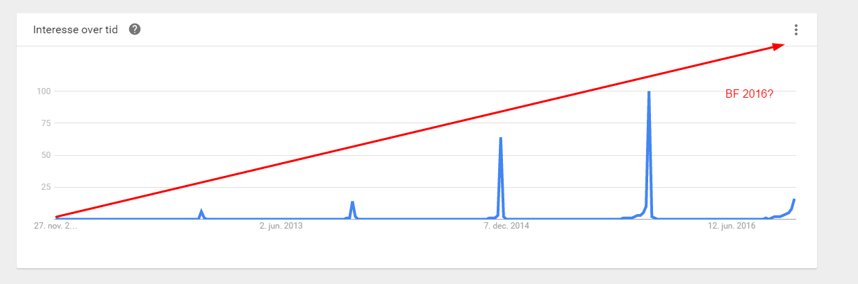Grafen viser tydeligt at søgeinteressen for Black Friday er steget voldsomt de seneste år. Således giver den røde pil, også et godt billede af, hvordan interessen for Black Friday kommmer til at se ud i 2016.