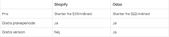 Shopify’s priser starter fra $29 om måneden. Odoos priser er ikke direkte angivet af leverandøren, men de tilbyder en gratis prøveperiode og en gratis version.