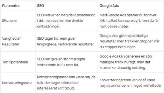 Lad os sammenligne SEO og Google Ads på forskellige områder: