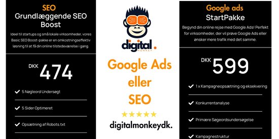 Valget mellem SEO og Google Ads afhænger af din virksomheds behov, budget og tidshorisont. Begge metoder har deres fordele og kan være en værdifuld del af din digitale markedsføringsstrategi. Du kan endda bruge dem sammen for at maksimere din online synlighed og trafik. Det vigtige er at forstå, hvordan hver metode fungerer, og hvornår det giver mest mening at bruge hver enkelt. Hos DigitalMonkey.dk er vi klar til at hjælpe dig med at navigere i disse beslutninger og skabe en effektiv digital markedsføringsstrategi, der passer til dine unikke behov.