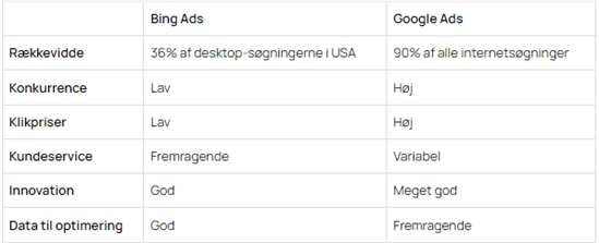 Lad os nu se på en direkte sammenligning mellem Bing Ads og Google Ads i den følgende tabel: