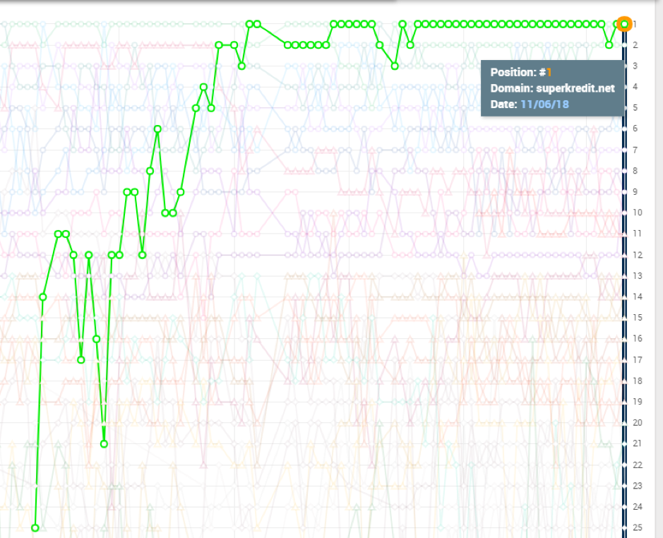 For det samme søgeord skød det danske affiliatesite superkredit.dk op i rankings i sept.-okt. 2018 fra side 3 til nr. 1, men inden da havde de i månedsvis bygget indhold og brugt en del penge på at købe links (+100k kr. Ifølge mine beregninger).