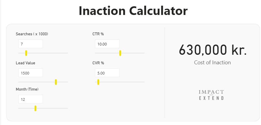 Med hjælp fra min kollega Rasmus Christiansen har jeg lavet en beregner, som gør det nemmere for dig at forstå, hvad du kunne have tjent ved at rykke på SEO. Jeg kalder den "Cost of Inaction"-beregneren, som er et udtryk jeg først hørte om fra SEO-eksperten Heather Physioc.