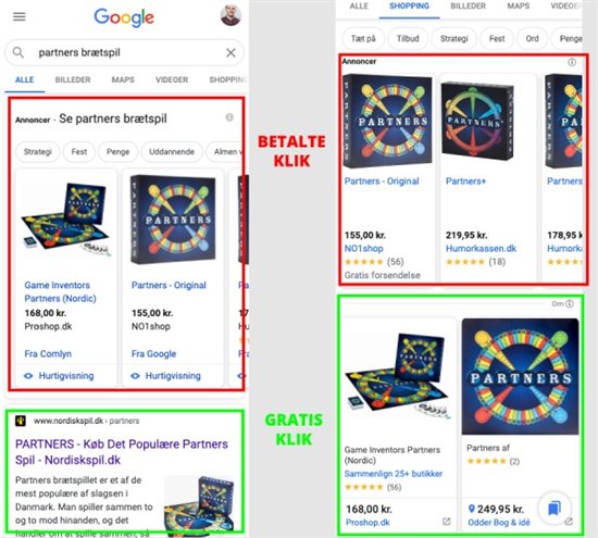 Resultaterne markeret med rødt er betalte Google Shopping annoncer.