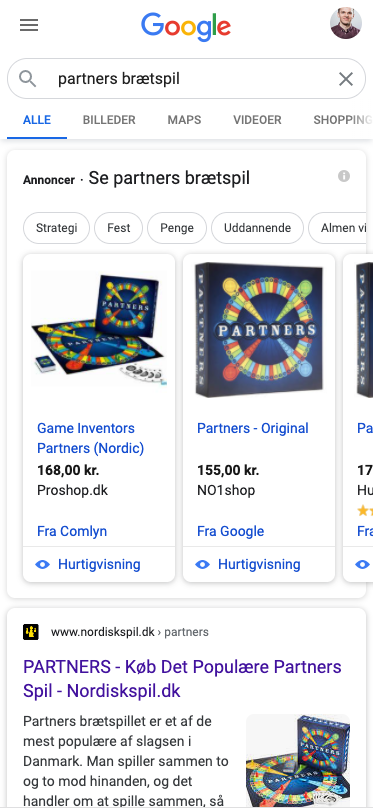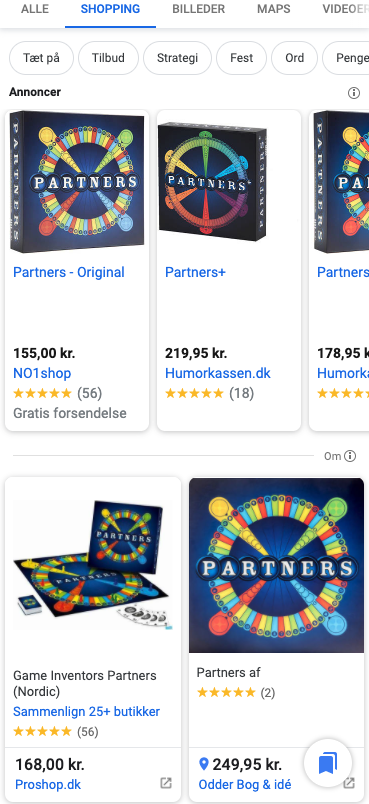 Almindelig Google-søgning med shopping annoncer i toppen: