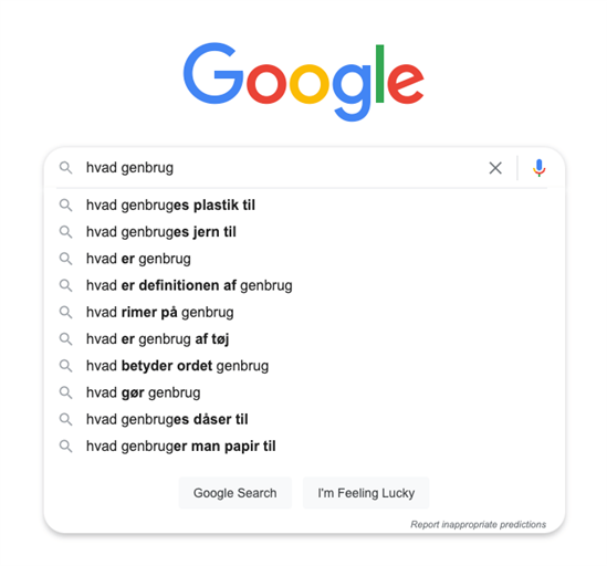 Skriv dit emne i Googles søgefelt. Prøv også med forskellige relaterede ord. Se hvilke spørgsmål, ord eller sætninger Google foreslår under søgefeltet.