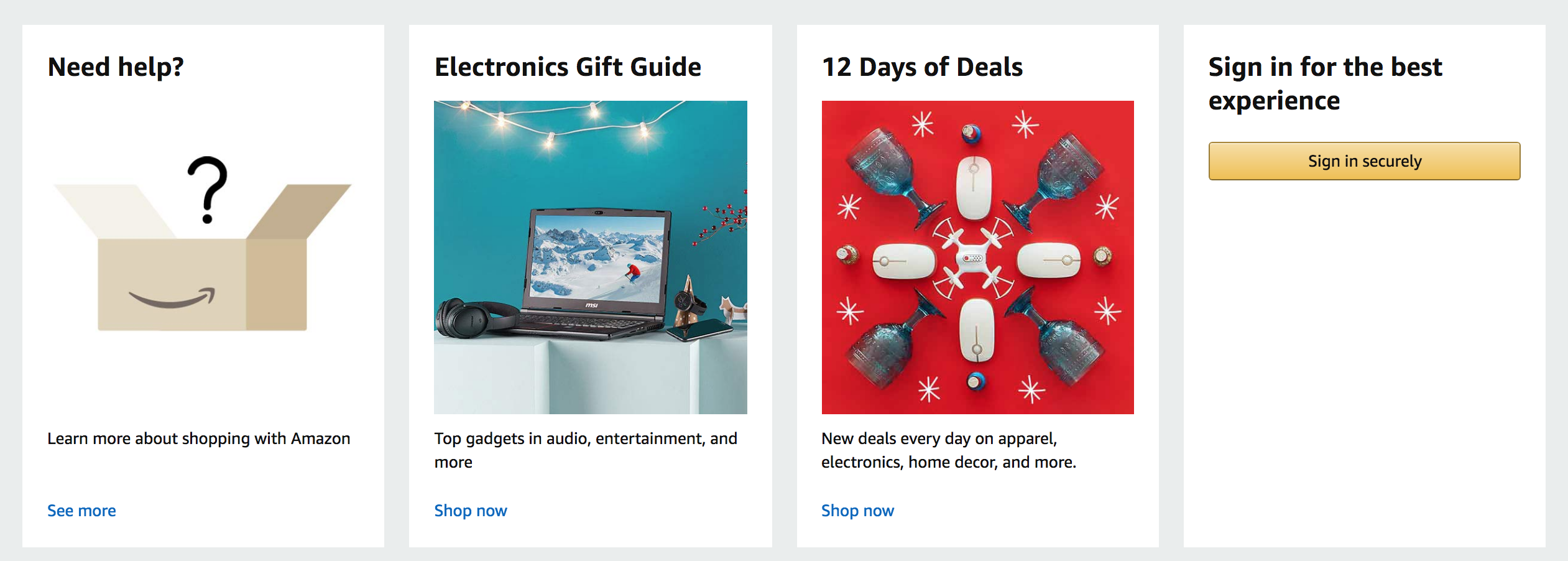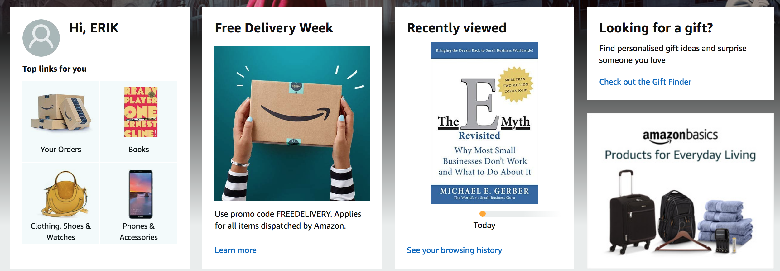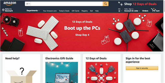 Amazon er en af de hjemmesider, som bruger mange ressourcer på at personalisere deres indhold, da de er bevidste om, at det kan påvirke de besøgende - i en positiv retning. På Amazon har du nemlig mulighed for at oprette en bruger, hvilket af naturlige årsager kan give en personaliseret oplevelse, hvis man er logget ind.