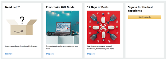 Amazon har valgt at indsætte et budskab i højre side af deres header, som de løbende ændrer. Her kan du som webshopejer fremhæve noget, som er relevant for den gældende sæson eller du kan fremhæve dine USP’er.