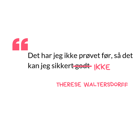 Men for Therese forholder det sig lige omvendt; Hun fortæller mig, at hun faktisk kan blive ked af det, når folk beskriver sig selv med det citat, for med det siger de, at det har været nemt og ligetil for dem, at nå til hvor de er, og sådan har det slet ikke været for Therese i hendes personlige og faglige udvikling, frem til hvor hun er i dag.