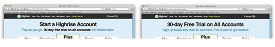 Virksomheden Highrise (hedder i dag Basecamp) skulle skaffe brugere til deres gratis udgave en digital HR-tjeneste. De havde hidtil arbejdet med formuleringen til venstre på deres hjemmeside:
