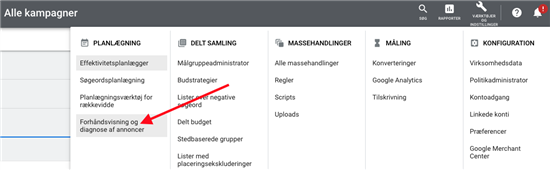 Hvis du på noget tidspunkt – nogensinde! – skal undersøge, om dine egne annoncer vises, så gør det via værktøjet ”eksempelvisning og diagnosticering” i Google Ads. Her kan du få oplysninger om din annonce uden at generere et hav af annoncevisninger uden klik (ja, for du klikker vel ikke på dine egne annoncer?) og dermed generere en bølge af dårligt brugerengagement.