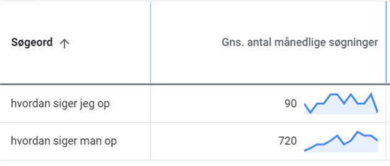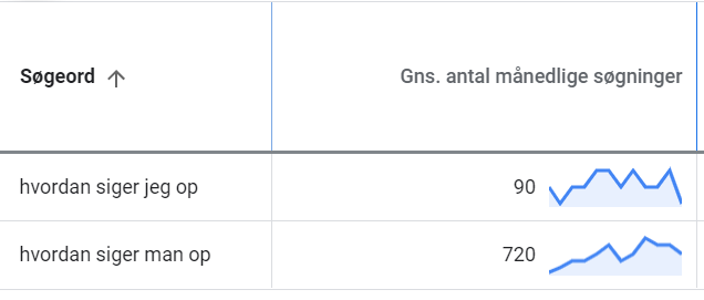 Det er svært at sige op og er du i vildrede over, hvordan du skal gribe det an, skal du ikke fortvivle – for så er du sådan set bare i båd med de 810 andre personer, der hver måned spørger Google, om netop det samme. De 810 personer er delt på blot to søgninger. Disse to er: ”hvordan siger jeg op” og ”hvordan siger man op”. Fælles for søgningerne er, at de begge peaker henover årets sidste 4 måneder med godt 1.000 månedlige søgninger - måneder der ligger i forlængelse af en afslappende sommerferie, men også måneder der indeholder et højt arbejdspres, et højt socialt pres og, nårh ja, firmajulefrokoster.