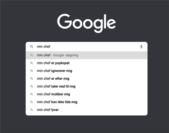 Men hvad har det så med ledelse og marketing at gøre. Jo, ser du – de sætninger, der fremkommer, kommer af en årsag. Den årsag er, at de er yderst populære set ud fra, hvad andre har søgt efter. Man kan altså sige, at det er søgninger, der trender. I forbindelse med min research til en ny bog om dårlig ledelse og ledelse generelt, faldt jeg over noget interessant, da jeg skulle til at lave søgningen ”min chef kan ikke lide mig”. Jeg nåede dog kun at skrive ”min chef” før mine øjne straks faldt på de 7 søgninger, som Google foreslog mig på baggrund af, hvad andre har søgt efter og dermed hvad der "trender". Og det var ikke ligefrem rosenrøde søgninger. Prøv selv at se her: