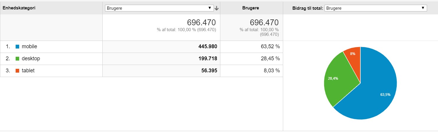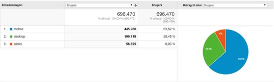 I hvert fald er statistikken tydelig. Nedenfor kan du se et eksempel fra en større danske webshop med en bred målgruppe. Her er det kun 28% der besøger websitet via en almindelig computer – resten handler ind via mobil eller tablet.