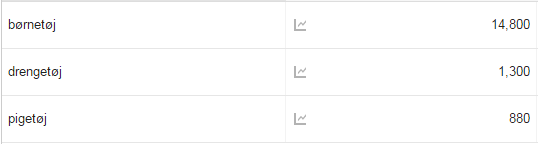 Og børnetøj er blot en af mange mulige børnetøjs-varianter folk søger på. Mange søger også på ”billigt børnetøj”, ”økologisk børnetøj”, ”tilbud på børnetøj”, og ”børnetøj størrelser” – for bare et nævne et par eksempler. Der er tilsvarende mange varianter for drengetøj, pigetøj osv.