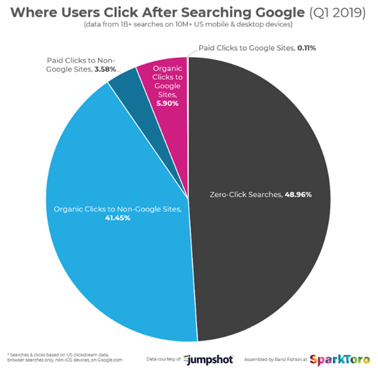 Det er helt korrekt, at Google – med et vist held, forsøger at holde på flere af brugerne selv. Det ses i ovenstående graf som bl.a. ”Zero Click Searches” og ”Paid Clicks to Google Sites”. Specielt det første har været stigende som følge af bl.a. flere Featured Snippets.