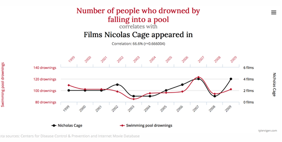 Med andre ord – blot fordi man (som det faktisk er tilfældet) kan dokumentere at flere mennesker drukner i swimmingpools, de år Nicolas Cage optræder i film betyder det ikke at det er den egentlige årsag til disse tragiske dødsfald.