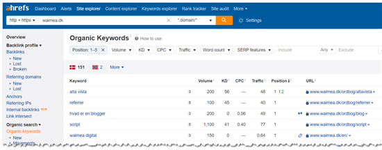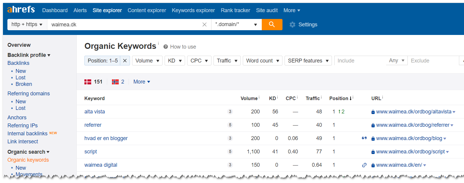 Det kan du f.eks. undersøge med Ahrefs (eller de fleste andre ranking-værktøjer). Søg på dit domænenavn, vælg rapporten ”Organic keywords” og filtrér resultaterne, så du f.eks. kun ser dem, der ranker fra nummer 1-5.