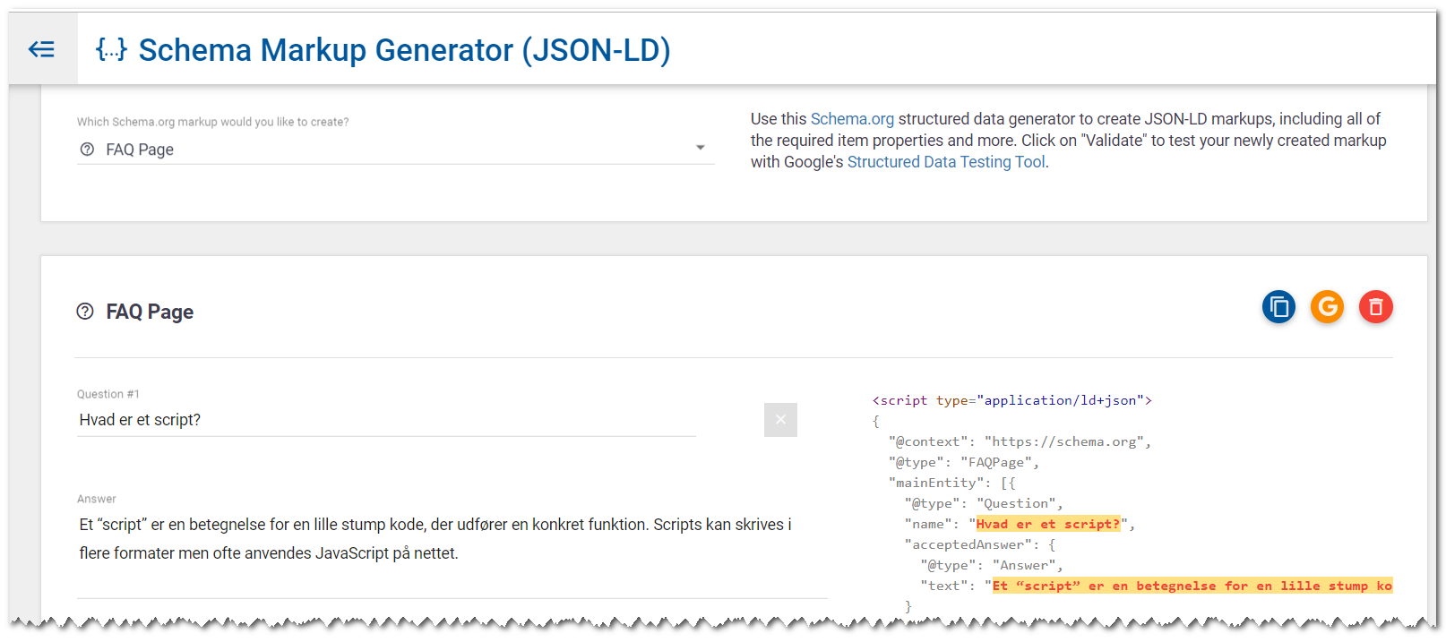 Her indtaster du dine spørgsmål og svar, og så genererer værktøjet den færdige Schema-kode i JSON-LD format.
