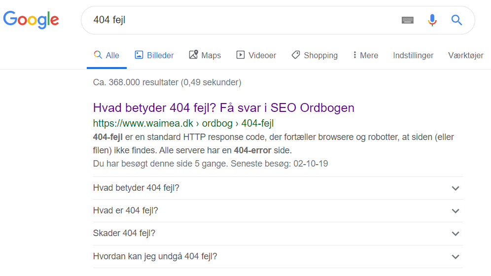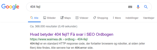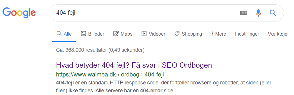 Når man søger på ”404 fejl”, dukker en af mine sider fra Waimea.dk op som nummer ét i Google. Det er jo i sig selv rigtig dejligt.