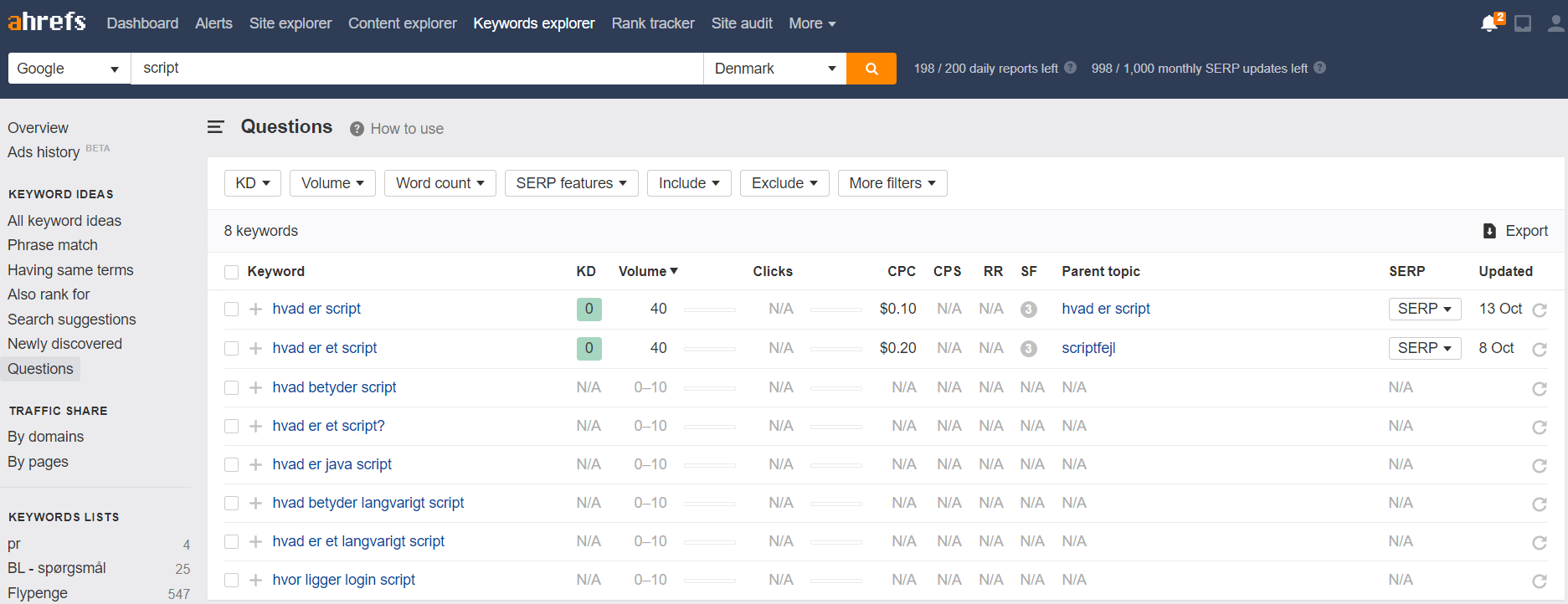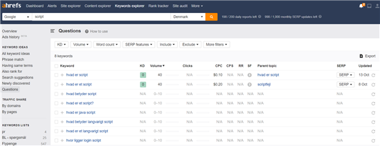 Næste skridt er så at tilføje noget FAQ-indhold på siden. Men hvad skal det være? Her kan du også bruge Ahrefs. Vælg ”Keyword explorer” og søg på dit keyword – i dette tilfælde ”script”.