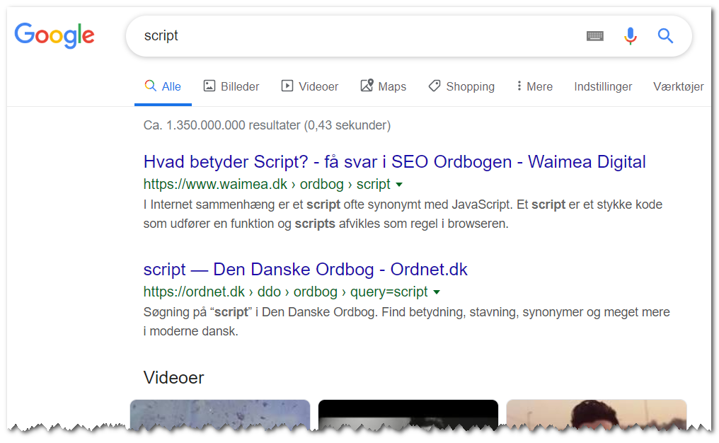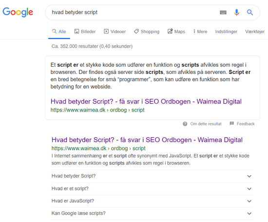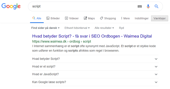 Og ikke nok med det. Søger du på ”Hvad betyder script”, er der nu både featured snippet og udvidet FAQ-visning med.
