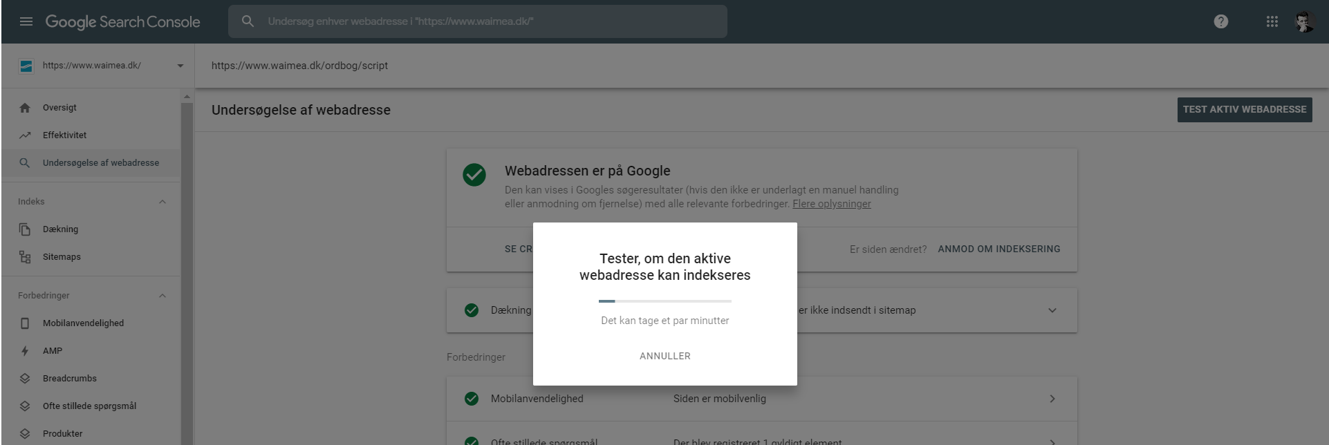 Gå ind på Google Search Console. Søg på din URL, den side du lige har opdateret, og klik på ”Anmod om indeksering”.