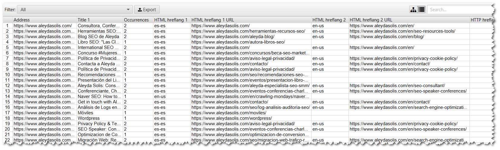 Når du har crawlet dit website, kan du under fanebladet ”Hreflang” se en analyse af din Hreflang implementering. Nedenfor kan du se et eksempel fra Aleyda Solis’ website.