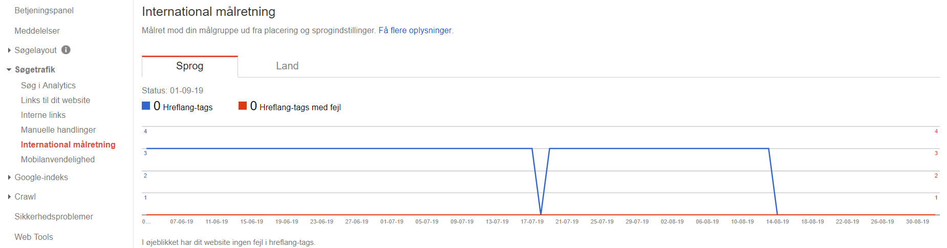 I den gamle version af Google Search Console var der en god rapport under Søgetrafik -> International målretning, som kunne vise dig, om der var fejl i din Hreflang implementering.