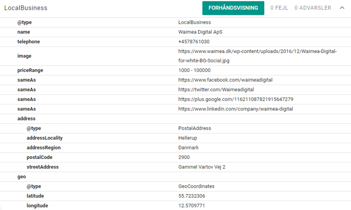 Nedenfor kan du se, hvordan LocalBusiness objektet ser ud på Waimea.dk.