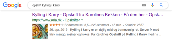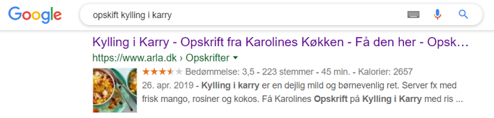 Der søges rigtig meget på opskrifter. Og hvis du bruger ”Recipe”-objektet, kan du angive detaljer om opskriften, hvoraf Google ofte viser nogle af dem direkte i søgeresultaterne.