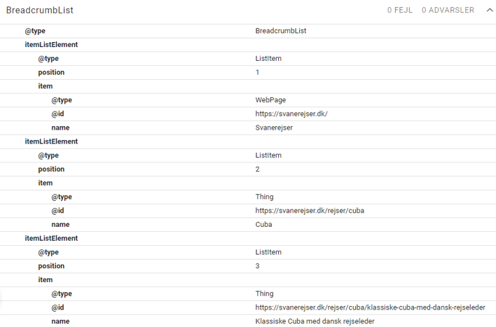 Nedenfor kan du se, hvordan den færdige Schema-data ser ud på Svanerejser-siden.