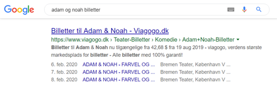Under ”Event” findes en rækkere mere specifikke objekter for forskellige typer af arrangementer – f.eks. ”TheaterEvent” (som er brugt ovenfor), ”Festival” og ”DanceEvent”. Vælg det objekt, der passer bedst til dit arrangement.