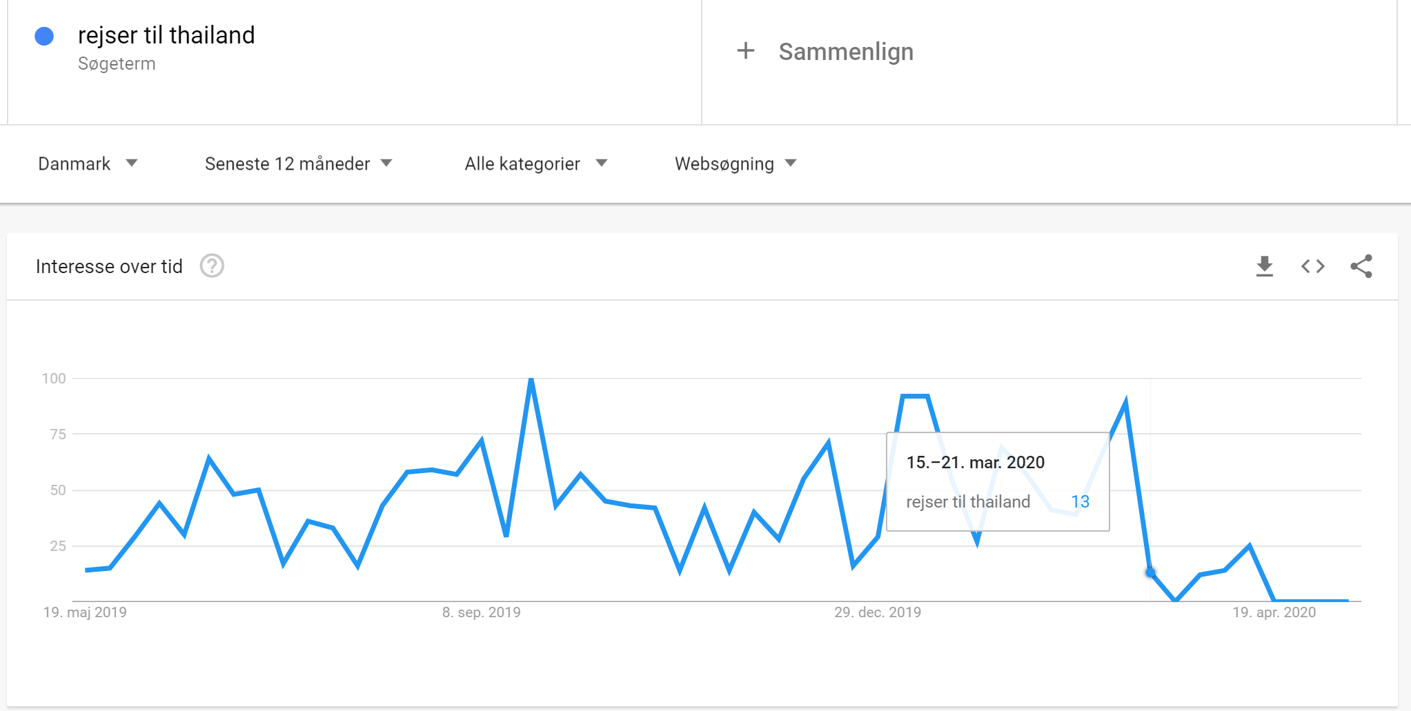 Hvis vi f.eks. ser på en søgning på ”Rejser til Thailand” røg søgningerne – logisk nok, på det nærmest i nul da grænserne lukkede.