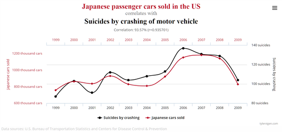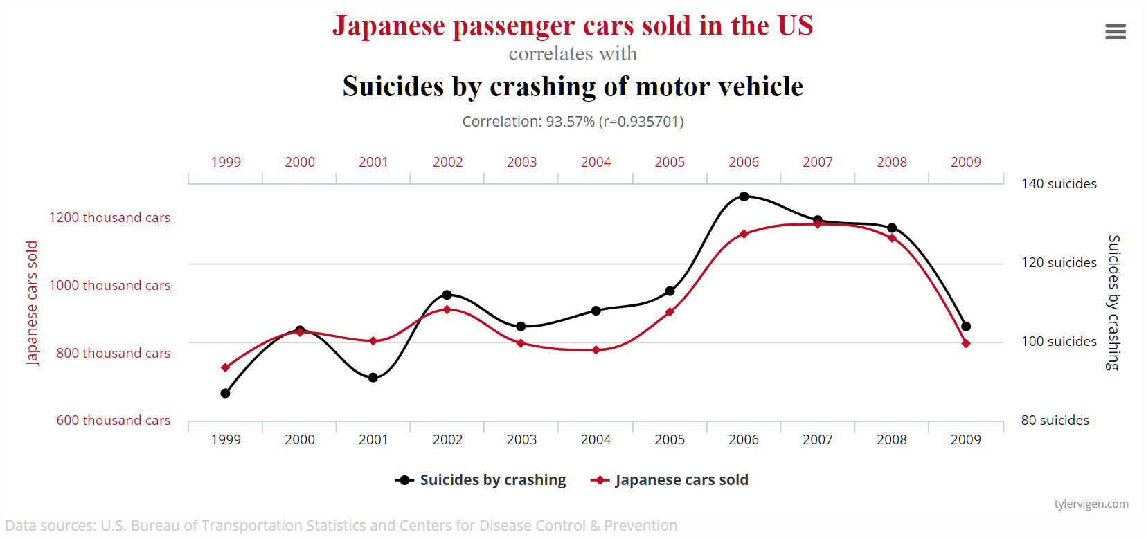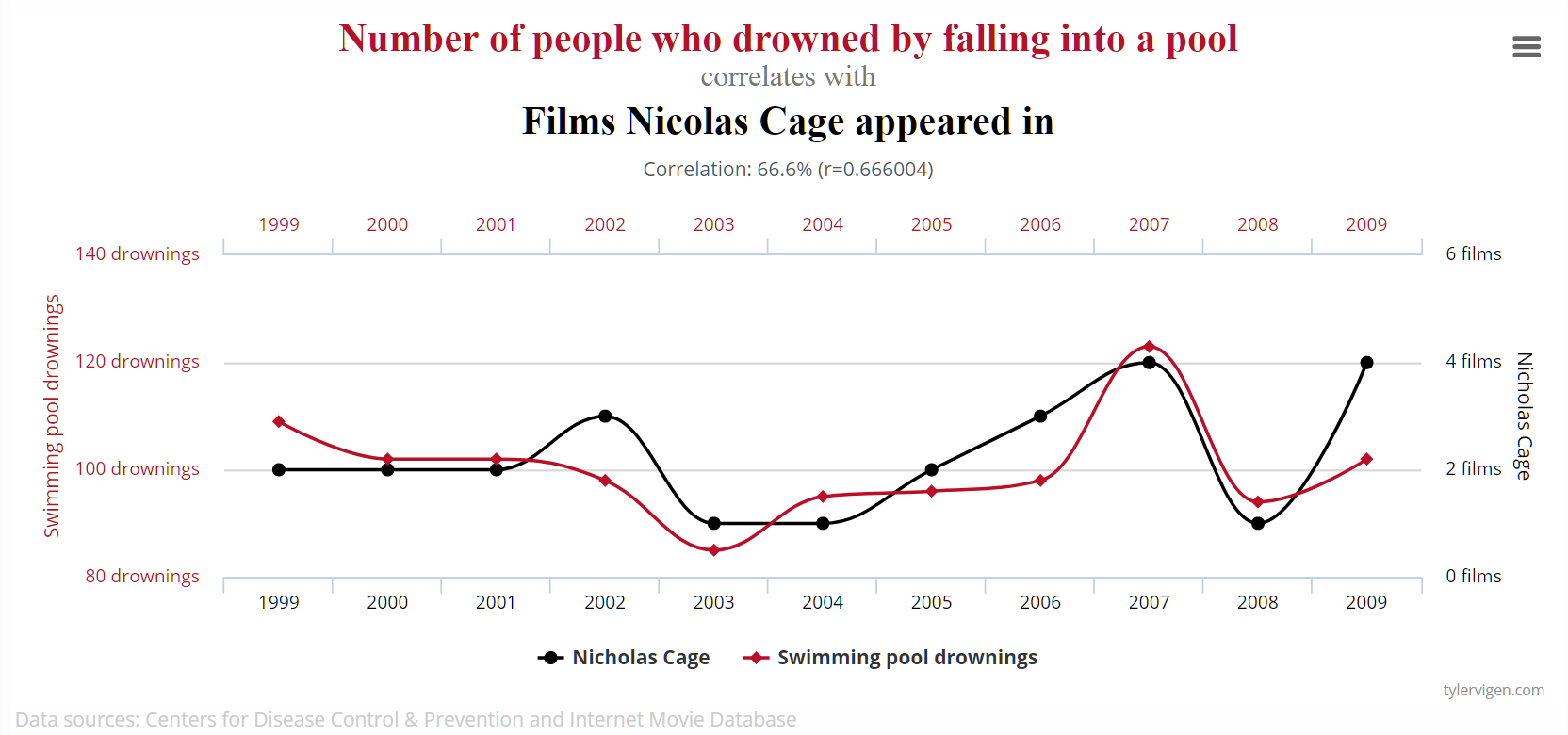 Der er masser af sjove eksempler på dette. For eksempel følger fødselstallet (i mange år) antallet af ynglende storke, antallet af selvmord i biler i USA følger ret præcist antallet af solgte japanske biler og antallet af mennesker der drukner i en swimmingpool korrelerer med antallet film Nicolas Cage optræder i.