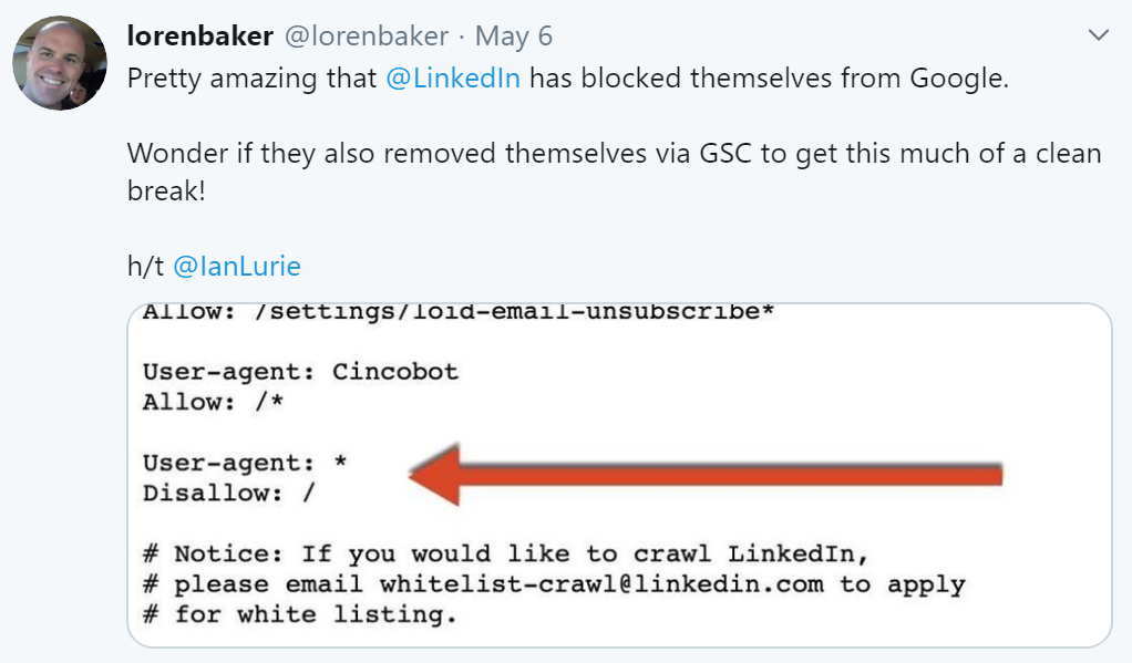 Det samme skete i forbindelse med den seneste Google opdatering for LinkedIn. Selv meget store virksomheder kan lave katastrofale fejl. Et eller andet fjols hos dem havde fået indsat en udelukkelse af hele www-versionen af deres website. Og det respekterede Google naturligvis – så pludselig havde de absolut ingen af deres sider under www indekseret!