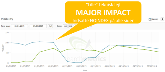 Netop det skete for nogle år siden for en af mine kunder. Deres udviklere havde rettet noget og ved en fejl fået indsat META-robots NOINDEX på så godt som alle sider. Og det respekterede Google naturligvis og deres synlighed faldt naturligvis med det samme.