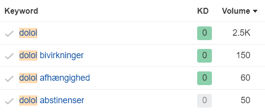 Hvis vi f.eks. ser på et keyword som ”Dolol” (der er et smertestillende middel), så kan vi se, at der naturligvis er mange der søger direkte på kun det ord, men at der også er en del, som søger på bl.a. bivirkninger, afhængighed og abstinenser – hvilket vi i øvrigt oplever med det meste medicin og behandlingsmetoder.