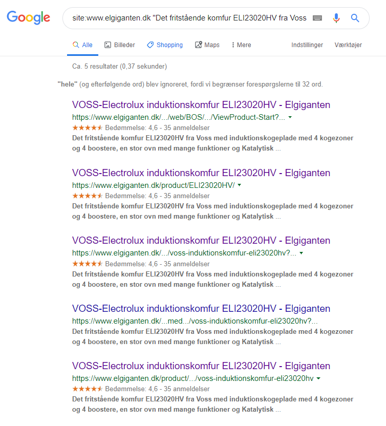 Hvis du ikke alene vil se, om der er identiske versioner af teksten på dit eget website, men på tværs af sites, kan du udelade site:www.elgiganten.dk og blot søge på teksten i citationstegn.