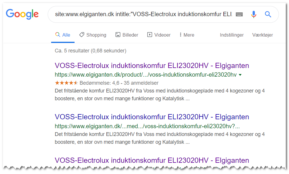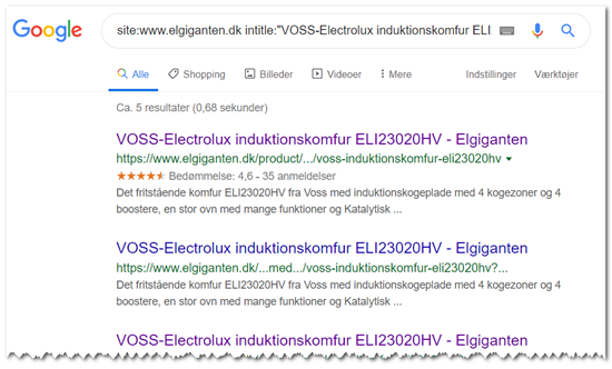 I det konkrete eksempel finder Google 10 resultater på forskellige websites, hvoraf i hvert fald de første 3 ser helt identiske ud – Elgigantens almindelige version, en version fra et færøsk website (med dansk tekst) og så en elektronisk tilbudsavis fra Elgiganten.