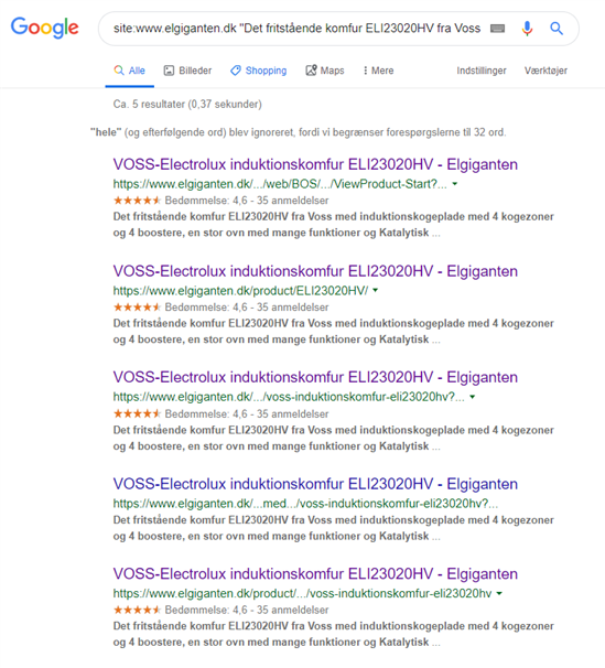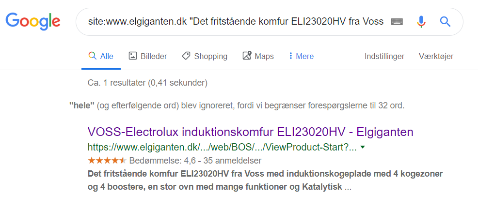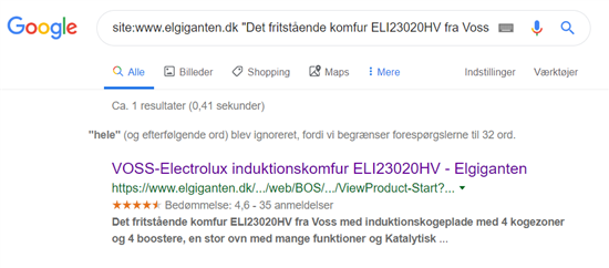 Hvis vi søger på site:www.elgiganten.dk efterfulgt af den første del af produktteksten i citationstegn, så søgningen således ud (da jeg lavede den):