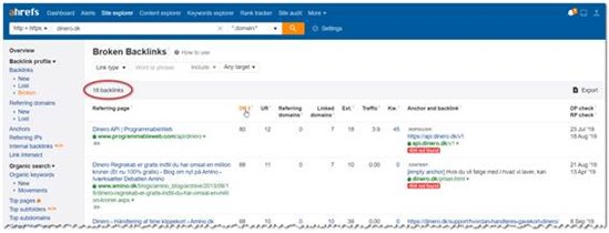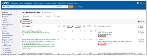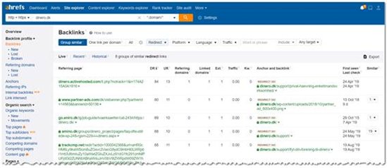 I værktøjet Ahrefs.com kan du få en rapport over alle de links, der peger på dit website, men som enten går til døde sider, eller som redirectes.