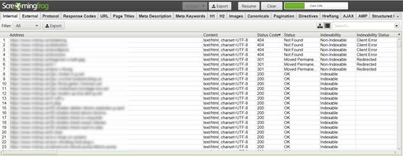 Resultatet ligner meget det, du får fra en almindelig crawling, men i denne omgang skal du alene se på den første side – oversigten over, hvordan dit nye website svarer på de gamle URL’er. Nedenfor kan du se et eksempel.