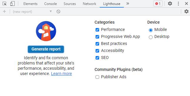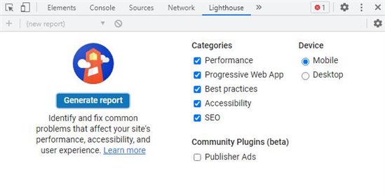 Du skal vælge det sidste faneblad ”Lighthouse”. Her kan du så afkrydse, hvad det er, du vil teste – f.eks. ”Performance” og ”SEO”. Vælg at teste med mobil device.