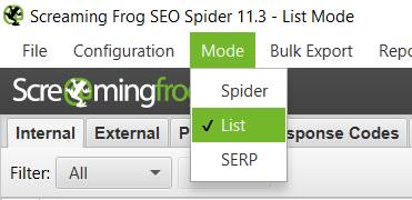 Åbn en frisk version af Screaming Frog og skift til ”list mode” under ”mode”.