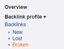 Når du er logget ind på Ahrefs.com, skal du først søge på dit website. Herefter kan du via navigationen til venstre vælge Backlinks -> Broken