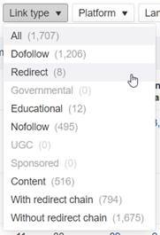 Hvis du vil se alle de links, der er redirectede, skal du vælge Backlinks og så via Link Type drop-down menuen i toppen vælge ”Redirects”.