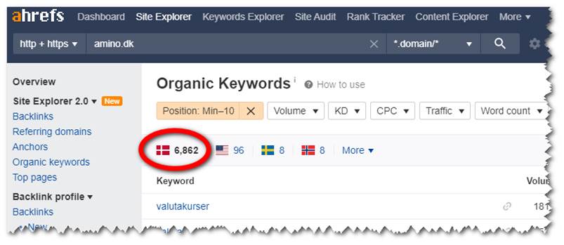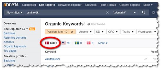 Antallet af unikke domæne kan også tjekkes på Ahrefs.com. I Aminos tilfælde kommer der links fra hele 12.233 domæner!