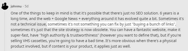 Og sjovt nok ved de det også godt selv. Indimellem slipper det ud mellem linjerne, som da en af Googles ledende søgemaskinefolk John Muller for nyligt svarede på et spørgsmål på Reddit om, hvad man kan gøre for at rette op på manglende synlighed.